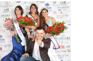 El cantante local Omar Vedoy, es flanqueado por las bellezas Vanessa Huaracha, primera finalista de …